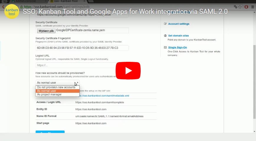 - Then download the security certificate from Google Admin Console window and upload it to Kanban Tool's SAML settings