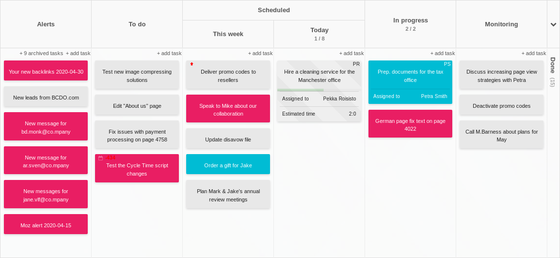 The time driven take on a basic workflow. Suitable for teams, whose work is organized by certain, planned events in time. Perfect for people and organizations, that have an extensive backlog and slice it into a soon - very soon - now manner, without more specific dates.