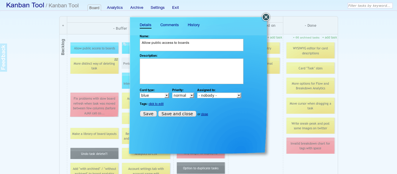 Many scrum teams used pinboards with user story cards, as information radiators. This usually worked like this - during the sprint planning, each user story, or a feature to be implemented, was written on a separate physical card. Together, these cards formed a sprint backlog and were placed on a big board somewhere in the office, accessible to all team members. Each team member could walk up to the board, take a look at the stories and pick one, which they wanted to implement next. They’d then take such a card to their desk, and once the work was done, the card was struck-out and returned to the board. This simple system was ingenious. It provided high visibility into progress, allowed for synchronization of work between multiple programmers, and improved the flow of work since each programmer could pick the type of work they felt best at. -