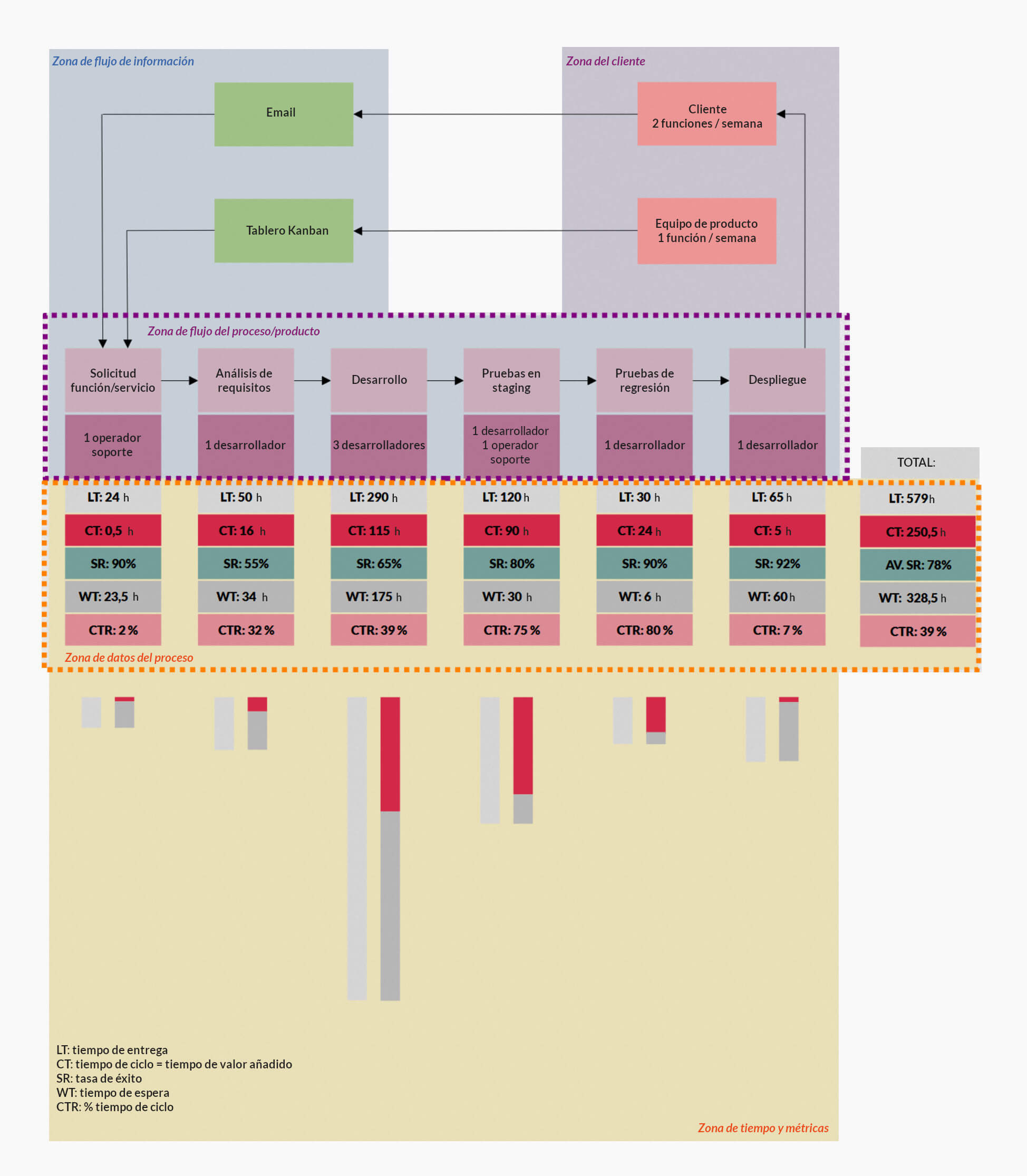 Como capa de resumen, distingue entre el tiempo de valor añadido y el tiempo total de entrega. La relación entre ambos revela la verdadera eficiencia del proceso.